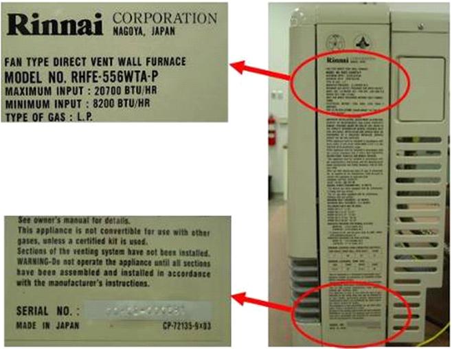 (6) 詳情描述 此召回品型號為RHFE 431 和 RHFE 556。使用天然煤氣或LP煤氣(丙烷)其中任一種皆可。此次召回型號如下:Model RHFE-431 FAIII-N FAIII-P WTA-N WTA-P WTA-72B-N WTA-76B-N,Model RHFE-556 FAIII-N FAIII-P WTA-N WTA-P。此款型號的流水碼印在後面外殻右邊的頂端。召回品包括2000年2月至200712月製造的機組。製造日期编號是4個一組的系列序號,依照年、月順序編寫,與流水碼一同位於底端。