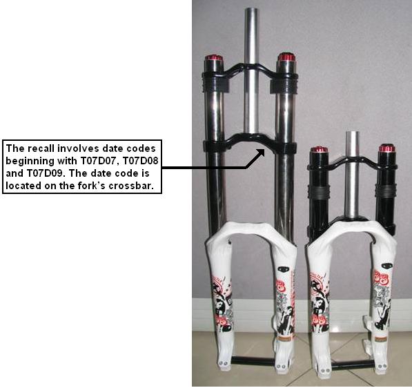 (5) 瑕疵情形:自行車懸掛系統包含召回的車叉,在強而有力的落地之後,車叉可能被完全地壓緊,並且無法回復至它最初的位置,這可能造成騎乘者失去對自行車的控制和墜落地面,如果消費者試圖自己修補,前叉可能無預期的彈開,對消費者造成嚴重傷害。