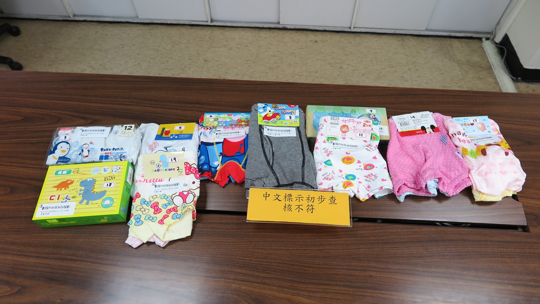 標準檢驗局說明,兒童內褲商品屬該局公告「成衣」應施檢驗品目,「中文標示」經初步查核計10件(項次3、5、6、8、9、11、14、17、18、19)未依「服飾標示基準」規定部分,已移請經濟部中部辦公室依「商品標示法」處理。