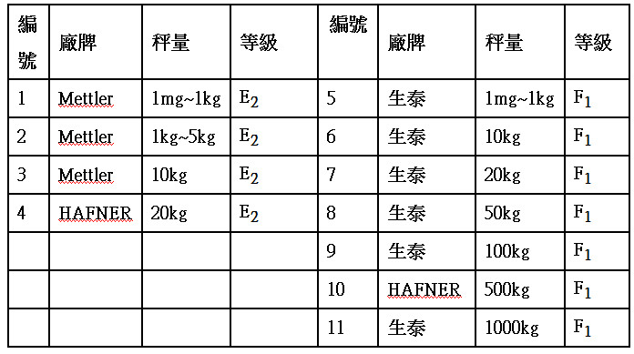 主要檢定設備:標準法碼、質量比較儀、電子天平、固定式起重機、電動堆高機。