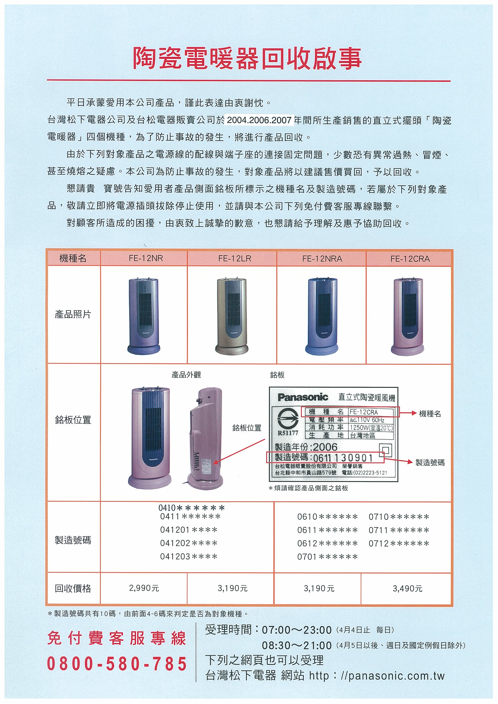 台灣松下電器公司陶瓷電暖器回收/召回訊息