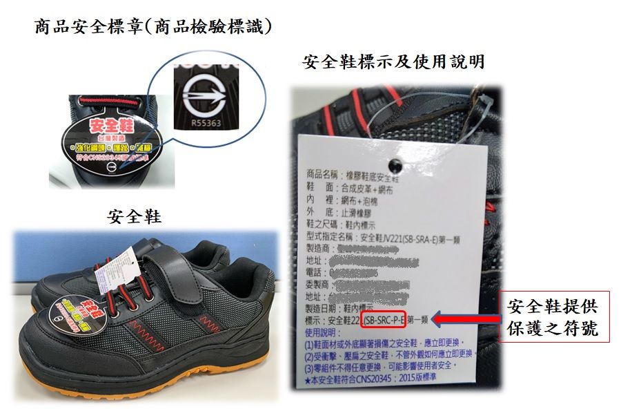 一、選購時請注意安全鞋是否標示尺寸、製造商或進口商、製造年月及安全鞋所提供保護之符號。